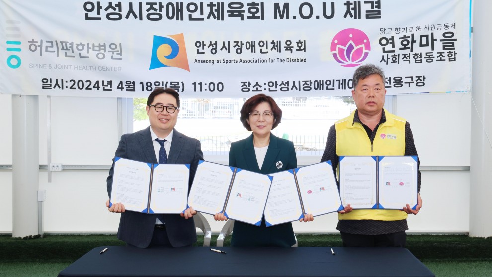 안성시장애인체육회 허리편안병원, 연화마을 M.O.U 체결 페이지 정보 작성자작성자 : 관리자 조회조회수 : 1,726회 작성일작성일 : 24-06-25 10:28 본문 안성시장애인체육회와 허리편안병원, 연화마을이 M.O.U 체결을 하였습니다.2024.04.18 목록 이전글안성시장애인체육회 공도-창조로타리클럽 M.O.U 체결 24.06.25 다음글안성시장애인체육회 공도 어머니 자율방범대 M.O.U 체결 24.06.25